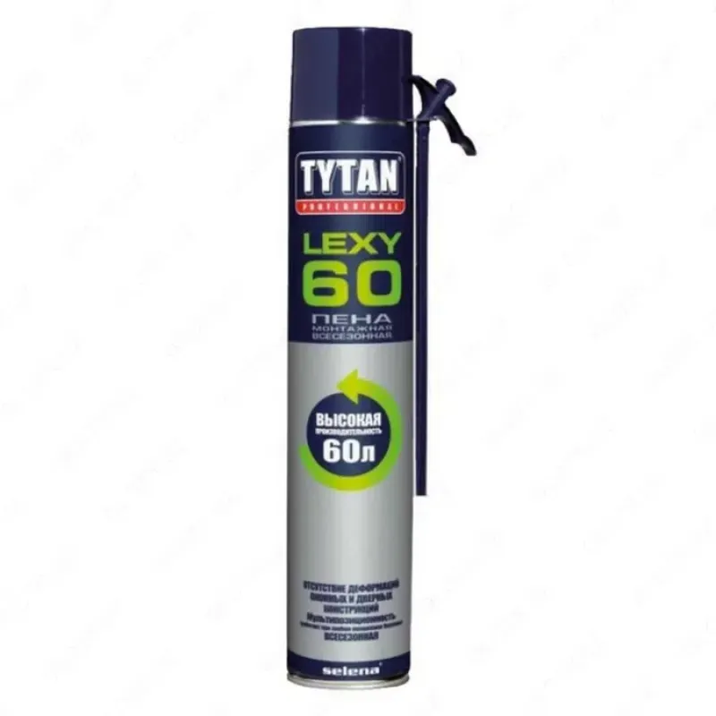 TYTAN LEXY 60 — всесезонная бытовая монтажная пена с высокой производительностью, низким вторичным расширением и быстрым отверждением. Подходит для профессионального монтажа окон и дверей, тепло- и звукоизоляции, а также заполнения и герметизации щелей.