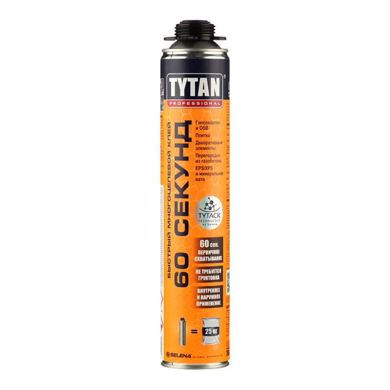 TYTAN 60 Секунд — быстрый пено-клей для ускорения строительных и ремонтных работ. Обеспечивает мгновенную фиксацию уже через 1 минуту после нанесения, не деформирует контактные поверхности и обладает высокой адгезией к большинству строительных материалов. Баллон заменяет до 25 кг обычного клея и позволяет наносить до 40 метров полосы.