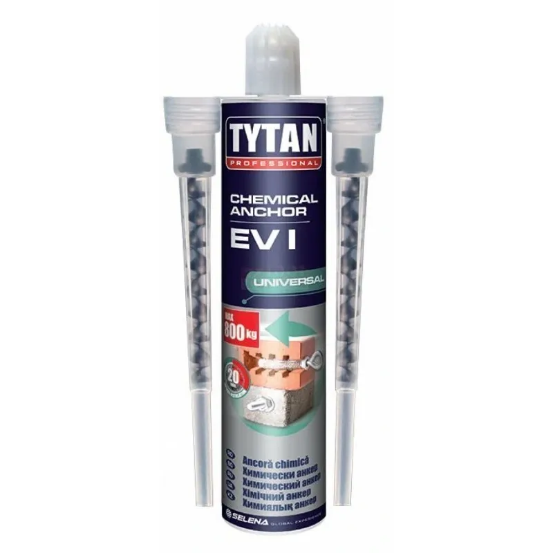 Химический анкер TYTAN EV–I — это универсальный состав на основе полиэфирной смолы, предназначенный для надёжного вклеивания резьбовых шпилек, болтов, арматурных прутков и других стальных крепежей. Применяется в строительных основаниях из монолитного и ячеистого бетона, кладке из кирпича, а также натурального и искусственного камня. В пустотелые материалы монтаж выполняется в комплекте с сетчатой гильзой, что обеспечивает прочность и долговечность крепления.