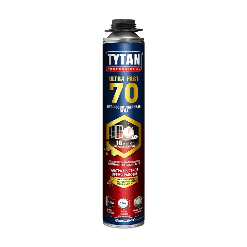 Tytan ULTRA FAST 70 — высокопроизводительная профессиональная пистолетная монтажная пена для быстрого и точного заполнения швов, щелей и пустот. Обеспечивает отличную тепло- и звукоизоляцию при монтаже оконных и дверных блоков, а также инженерных систем.